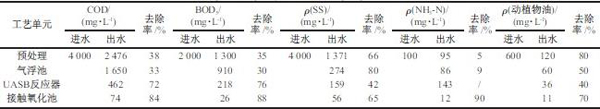 廢水首先經(jīng)過粗細兩道格柵,粗格柵設在進水口處,以去除廢水中較大漂浮物,細格柵設置在提升泵房后,用以攔截廢水中的碎毛發(fā)和部分懸浮物,格柵出水經(jīng)提升泵提升進入平流隔油沉淀池,一方面可以除掉漂浮的油脂、油塊,另一方面又可以使大部分不溶于水、密度大于水的雜質(zhì)沉淀下來。沉淀池出水自流進入曝氣調(diào)節(jié)池內(nèi),調(diào)節(jié)水量,通過曝氣充分混合均勻水質(zhì),同時進行預曝氣。廢水隨后進入氣浮池內(nèi),通過投加適當?shù)乃巹┗炷图訅喝軞鈿飧。顾械姆稚⒂汀⑷芙庥图捌渌糠蛛s質(zhì)、SS 得到很好的去除。氣浮池出水進入UASB 厭氧池進行生化處理,通過微生物作用將復雜的有機大分子物質(zhì)降解為簡單的有機物。廢水經(jīng)UASB 后自流進入接觸氧化池,有效去除COD 和NH3-N。氣浮池、UASB 厭氧池、接觸氧化池剩余污泥進入儲泥池濃縮后,在污泥脫水車間用帶式濃縮脫水一體機進行壓濾脫水,干污泥定期外運處置,儲泥池上清液和壓濾液回流到廠區(qū)污水系統(tǒng)進行再處理。
