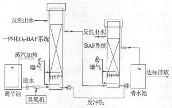 目前常采用化學氧化—生化組合工藝處理難生物降解有機廢水,其中化學氧化可去除難降解有機物或改善廢水的可生化性,而生物處理技術具有處理費用低、對多種有機污染物處理效果好等優點。研究表明,一體化臭氧曝氣生物濾池(O3-BAF)系統對含難生物降解有機物的廢水具有良好的處理效果且工藝簡單,占地面積少,運行成本低。