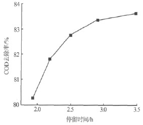 由圖5 可見,COD 去除率隨停留時間的增大而增大,但COD 去除率增長速率逐漸降低。當停留時間大于2.5 d 后,去除率增長緩慢,基本保持在82.5%~83.5%。說明在此范圍內增加停留時間,并不能有效地提高反應器的處理效率。考慮到工程應用的能耗因素,選取停留時間為2.5 d。具體參見http://www.bnynw.com更多相關技術文檔。
