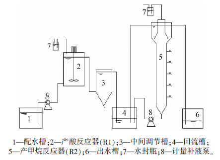試驗(yàn)裝置如圖1所示。產(chǎn)酸反應(yīng)器和產(chǎn)甲烷反應(yīng)器均由有機(jī)玻璃制造。流量由計(jì)量補(bǔ)液泵控制,反應(yīng)器內(nèi)水溫由加熱裝置控制在(35±1) ℃。