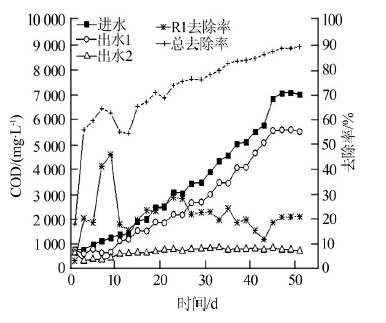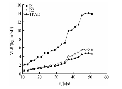 啟動(dòng)36~51 d,兩相厭氧反應(yīng)器HRT降為36 h,R1的VLR從10 kg/(m3·d)增加到14 kg/(m3·d),出水COD去除率平均為18.5%。R2去除率進(jìn)一步提高,總?cè)コ视?3.7%上升到89.5%。