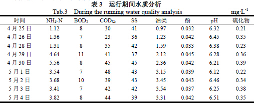 整個裝置2013 年下半年調試使用,2014 年4 月25 日~2014年5 月4 日出水水質分析,如表3,可以分析得出出入水質達到《山東省南水北調沿線水污染物綜合排放標準》(山東省地方標準DB37/599-2006)排放標準。具體參見http://www.bnynw.com更多相關技術文檔。