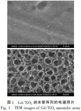 采用陽極氧化法制得釓摻雜TiO2納米管陣列。經(jīng)過熱處理后,摻雜的釓元素以取代的方式進(jìn)入TiO2晶格,電鏡照片如圖1 所示。形成的納米管長度為幾百nm 到幾μm 之間,管徑為20~200 nm,由于摻雜量和分散的關(guān)系,在TiO2納米管表面觀察不到釓顆粒。從照片上可看出,形成了結(jié)構(gòu)規(guī)整、排列整齊的納米管陣列。
