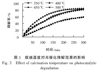由圖3 可看出,隨著煅燒溫度的升高,催化劑對黃連素溶液的降解率明顯升高。到達(dá)一定溫度后,降解率有下降的趨勢,450 ℃時降解效果最好。300 min 后,在煅燒溫度為450 ℃下的降解率達(dá)到85.01%,在350、400、500 ℃下的降解率分別為59.15%、81.98%、82.35%。