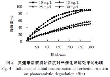 由圖4 可看出,在研究范圍內(nèi),隨著黃連素溶液濃度的升高,其降解率降低,當(dāng)黃連素溶液的質(zhì)量濃度為10 mg/L 時,降解率最高。造成此現(xiàn)象的主要原因可能在于隨著溶液初始濃度的升高,溶液顏色加深,阻礙了光線透過溶液到達(dá)鈦板表面,使得到達(dá)催化劑的光照強(qiáng)度降低,從而影響了光催化效果。
