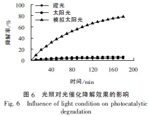 光照條件是影響降解率的最主要因素。當(dāng)以光子能量≥TiO2的帶隙能(Eeg)的光波輻射照射TiO2時(λ≤387. 5 nm),處于價帶的電子被激發(fā)到導(dǎo)帶生成空穴(h+),水溶液中的TiO2通過光照產(chǎn)生強(qiáng)氧化性的·OH,通過·OH、h+和·O2- 等將有機(jī)物逐步氧化,使降解率顯著提高。TiO2的帶隙能為3.2eV,低于387.5 nm 的光波均可激發(fā)TiO2。模擬太陽光由于光照連續(xù),強(qiáng)度保持不變因而光催化效果較好,真實(shí)太陽光的光強(qiáng)隨時間變化,因此其光催化效果較差,而避光由于沒有能量激發(fā)TiO2產(chǎn)生活潑自由基與有機(jī)物反應(yīng),因此降解效果最差。由上述試驗(yàn)可知,光照是光催化反應(yīng)的必要條件。