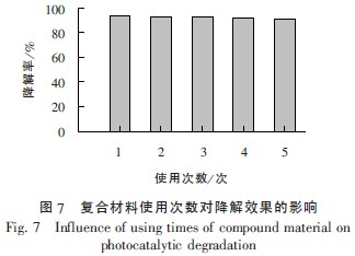 在黃連素溶液的初始質(zhì)量濃度均為20 mg/L,釓摻雜TiO2納米管復(fù)合材料的濃度為0.007 5 mol /L,煅燒溫度為450 ℃,反應(yīng)時間為300 min,pH值為10 的條件下,進(jìn)行光催化降解穩(wěn)定性試驗(yàn),重復(fù)試驗(yàn)時每次更換新的黃連素溶液,結(jié)果如圖7所示。由圖7 可知,重復(fù)試驗(yàn)進(jìn)行5 次后,催化劑活性基本保持不變,這說明釓摻雜TiO2納米管復(fù)合材料光催化劑具有一定的工業(yè)應(yīng)用前景。