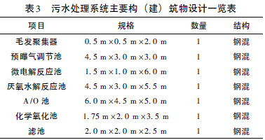 假發制品是以人體的毛發為原料,通過酸洗、水洗、脫色、染色和整洗等工藝制成,由此產生的假發制品廢水主要來自酸洗、水洗、染色三道工序。其中因在染色工藝中使用大量的中性染料,故原水的色度較高。酸洗工藝中投加大量的(濃)H2 SO4,故原水的酸性較大(pH 值最低達3. 0)。另外由于在生產過程中投加大量的NaClO、H2O2、NaS2O3、焦磷酸鈉、氨水以及少量的柔軟劑、表面活性劑和無機助劑,同時人體毛發在加工過程中會脫落發膠、油脂、膠蛋白和維生素等,因此原水成分復雜且可生化性差(BOD5/COD≈0. 25),有些物質對微生物可能有毒害作用,抑制微生物的生長。