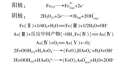 在電絮凝的反應單元中,陽極發生氧化反應,Fe先被電解形成Fe2+,再進一步被水中的溶解 氧氧化形成Fe3+;陰極在電流作用下產生H2和OH-。在離子擴散作用 下,OH-與Fe3+形成鐵的氫氧化物。同時,水溶液中的As (Ⅲ) 也發生了 氧化反應。L. C. Roberts 等已經證明,相比于三價鐵,二價鐵對三價砷的去除效果較好,這是 因為二價鐵在反應過程中會產生氧化中間產物,這種物質對三價砷的氧化效果較好。整個反應的方程式 如下: