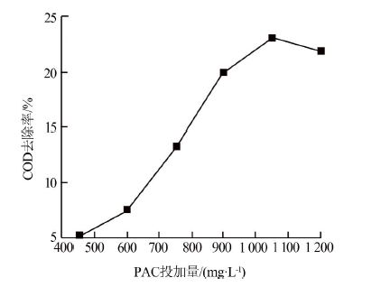 由圖 1可以看出,隨著PAC投加量的增加,COD去除率增大,當PAC投加量為1050mg/L時,COD去除率達到最大,為23.14%,繼續增加PAC投加量,COD去除率呈下降趨勢。過量投加PAC時,垃圾滲濾液中脫穩的膠體會再次達到穩定,使COD去除率下降。因此,混凝劑PAC的最佳投加量為1050mg/L。