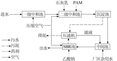 對廢水進(jìn)行物化預(yù)處理的目的是去除部分污染物(TFe、Zn2+),并完成pH的調(diào)整。采用兩級中和沉淀工藝:一級中和池采用價格低廉的石灰石進(jìn)行酸的預(yù)中和,減少中和藥劑用量;二級中和池通過投加石灰乳調(diào)節(jié)pH,并通過曝氣將Fe2+氧化成Fe3+。最終形成沉淀去除Fe2+、Zn2+;因泥量較大,為改善泥水分離效果,在二級中和池中加入聚丙烯酰胺(PAM),然后進(jìn)入沉淀池沉淀。污水經(jīng)物化預(yù)處理后,進(jìn)入后續(xù)生物脫氮處理過程。