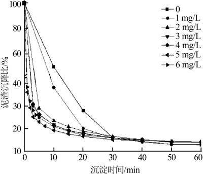 由圖 2可見,在PAM投加量較小時,隨著PAM投加量的提高,泥渣的沉降性能提高,達(dá)到相同沉降比所需時間縮短。當(dāng)PAM投加量大于3 mg/L后,泥渣的沉降性能變化較小。當(dāng)沉淀時間大于30 min后,泥渣的沉降比相差不大。