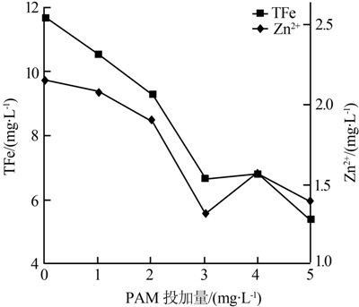 沉淀1 h后,取上清液測定不同PAM投加量下,TFe、Zn2+的去除效果,結(jié)果如圖 3所示。