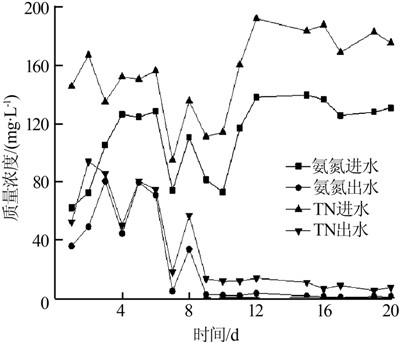 試驗中所用的接種污泥取自泰達(dá)污水處理廠,污泥呈灰黑色,曝氣48h后,污泥顏色轉(zhuǎn)為棕褐色,開始向反應(yīng)器加入試驗用水。SBR反應(yīng)器啟動馴化期間,通過控制排水比,調(diào)節(jié)反應(yīng)器內(nèi)污染物的濃度,并逐步將排水比提升至1∶2。連續(xù)監(jiān)測每個運(yùn)行周期進(jìn)水后,反應(yīng)器內(nèi)污染物濃度變化。監(jiān)測結(jié)果顯示:經(jīng)過20d的啟動馴化,TN、氨氮去除率可穩(wěn)定達(dá)到95%以上。啟動馴化期間,反應(yīng)器內(nèi)TN、氨氮的去除情況如圖 4所示。