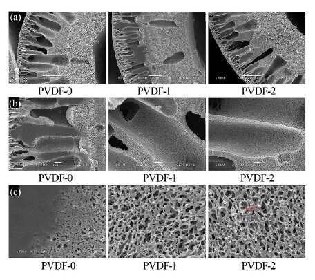 PVDF中空纖維膜是一種典型的非對稱性結構膜,其斷面主要以指狀孔結構和海綿狀結構組成,指狀孔結構占優勢表明膜的滲透性能較強,海綿狀結構占優勢表明膜的機械強度較好。圖 3(a)為250倍放大倍數下,3種PVDF中空纖維膜的SEM照片。由圖 3(a)可見,PVDF-0、PVDF-2指狀孔結構占優勢,而且孔較大,PVDF-1的海綿狀結構較多。這是因為添加適當納米TiO2削弱了成膜過程中非溶劑(水)/溶劑(DMAc)的相互擴散速度,發生了延遲相分離,從而有效減少了指狀孔結構,且形成的指狀孔也更加細小。圖 3(b)、圖 3(c)分別為1 000倍和10000倍放大倍數下,PVDF中空纖維膜斷面的SEM照片。由圖 3(b)、圖 3(c)可見,3種膜斷面形成的指狀孔結構差別不大,但從海綿狀結構中可以清晰看到添加的納米TiO2顆粒。與改性PVDF中空纖維膜相比,PVDF-0斷面結構孔隙不均勻,而PVDF-2因TiO2顆粒過多引起納米顆!皥F聚”不利于膜孔徑要求及膜表面穩定性。