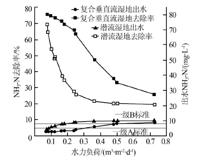 由圖 1可見,兩種人工濕地床的出水COD與水力負荷有密切關系,出水COD均隨水力負荷的提高而增大。水力負荷為0.167 m3/(m2·d)時濕地床出水COD均優于《地表水環境質量標準》(GB 3838— 2002)(以下簡稱水體)Ⅲ(20 mg/L)類水體標準,說明在此工況下人工濕地對COD達到十分顯著的去除效果。水力負荷<0.5 m3/(m2·d)時,濕地床對碳源均有較好的去除效果,COD去除率均在70%以上,出水均優于《城鎮污水處理廠污染物排放標準》(GB 18918—2002)(以下簡稱標準)一級A(50 mg/L)標準。繼續增加水力負荷達到0.725 m3/(m2·d),潛流人工濕地床對COD仍可達到很好的去除效果,COD去除率為80.25%,出水COD為33 mg/L,出水水質優于一級A(50 mg/L)標準,甚至達到Ⅴ類水體(40 mg/L)標準;而對于復合垂直流人工濕地,在水力負荷為0.725 m3/(m2·d)時,COD去除率為65.1%,出水COD為58 mg/L,出水水質僅能滿足一級B(60 mg/L)標準。整體而言,相對于復合垂直流人工濕地,潛流人工濕地對碳源的去除效果更佳。這與肖宇芳等的研究結果一致。此外,還可以看出:對于碳源的去除,潛流人工濕地床受水力負荷的影響更為顯著。