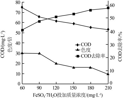 如圖 2~圖 4所示,初始pH對(duì)Fenton氧化反應(yīng)的影響較大,當(dāng)pH為2、6、7時(shí),反應(yīng)后出水COD高于生化尾水,出現(xiàn)這種現(xiàn)象的原因是pH過低或過高時(shí),催化反應(yīng)受阻,水樣中H2O2分解不完全,殘留的H2O2使測(cè)得的出水COD偏高。反應(yīng)的最適pH為4~5。調(diào)節(jié)pH到4左右,當(dāng)雙氧水投加質(zhì)量濃度達(dá)到600 mg/L時(shí)出水COD達(dá)到60.7 mg/L,COD去除率為51.8%,色度為12倍。繼續(xù)提高雙氧水的投加量,出水COD能達(dá)到60 mg/L以下,但對(duì)生化尾水的COD去除率提高較小。隨著FeSO4·7H2O投加濃度的加大,反應(yīng)后上清液COD降低,當(dāng)FeSO4·7H2O的投加質(zhì)量濃度達(dá)到150 mg/L時(shí),其出水COD為59.0 mg/L可以達(dá)到設(shè)計(jì)排放標(biāo)準(zhǔn)。為了降低處理成本,可以適當(dāng)降低雙氧水的投加量,提高FeSO4·7H2O的投加量。