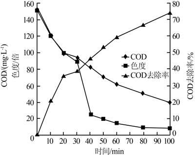 采用臭氧氧化處理生化尾水,分別在10、20、30、40、50、60、80、100 min時(shí)取樣,測(cè)定出水COD、色度,結(jié)果見圖 5。