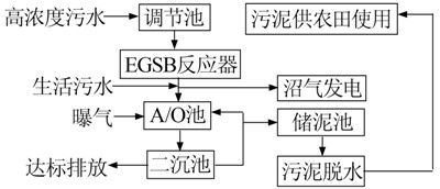 原污水處理站污水由兩部分組成,一部分是高濃度廢水,一部分是生活污水,高濃度廢水由各生產單位的生產廢水組成,高濃度廢水經過調節池調節后進入EGSB反應器進行厭氧處理,經過EGSB反應器的出水與生活污水共同進入A/O生物反應池進行好氧處理,A/O池出水進入二沉池,二沉池出水直接排放,具體污水及污泥處理工藝流程如圖 1。