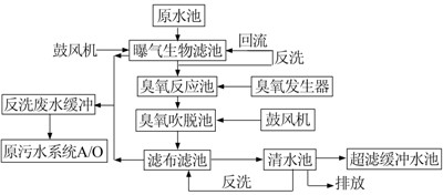 二沉池出水經過提升泵提升進入曝氣生物濾池,憑借曝氣濾池內粗糙多孔的球狀濾料,可以為生物提供較佳的生長環境,通過濾料的截留作用以及濾料表面微生物和代謝中產生的黏性物質形成的吸附作用來去除有機物,同時還可以降低出水中的懸浮物濃度,利于后續處理。曝氣生物濾池出水進入密封的臭氧反應池進行臭氧消毒,臭氧反應池出水進入臭氧吹脫池,防止水中殘留的臭氧對后續濾布濾池中的微生物產生影響。臭氧吹脫池出水進入濾布濾池,濾布濾池是采用濾盤外包濾布代替傳統濾池的砂濾料,可以截留粒徑為幾μm的微小顆粒,進一步降低出水中的細小懸浮物質。濾布濾池出水直接進入超濾緩沖池,利用超濾設備進行處理,超濾可以利用其多孔介質的攔截能力,用物理截留的方式去除水中一定大小的雜質顆粒,壓力驅動下,水、有機低分子等尺寸小的物質可以通過纖維壁上的微孔達到膜的另一側,溶液中菌體、膠體、有機大分子等大尺寸物質則不能透過纖維壁而被截留。曝氣生物濾池與濾布濾池進行反沖洗的濾液廢水回流至原有的A/O生化池。