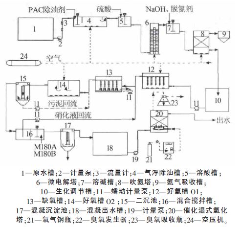 目前,國內外研究工作多集中于生物強化法及開發高級氧化技術處理常規焦化廢水,關于蘭炭廢水的文獻報道相對較少。筆者采用具有自主知識產權的除油—微電解—吹氨—高效菌種生化技術—混凝沉淀及催化氧化等聯合工藝處理蘭炭廢水,出水水質可達到《煉焦化學工業污染物排放標準》(GB 16171—2012)中的現有企業直接排放標準要求。