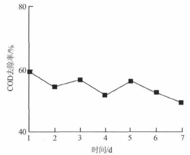 自制的鐵炭微電解填料主要利用了鐵的還原性、鐵的電化學性、鐵離子的絮凝吸附三者共同作用來處理蘭炭廢水。在酸性條件下,廢水通過填料時,鐵成為陽極,炭成為陰極,并有微電流流動,形成無數個小電池產生氧化還原反應,進而使有機物官能團發生變化;陽極產生的Fe2+可以生成Fe(OH)2、Fe(OH)3,具有較強的吸附及絮凝的能力,使廢水進一步澄清;陰極產生的H2具有還原性,可還原有機物進而降低廢水毒性,提高其可生化性。反復試驗證明自制的微電解填料解決了常見的結塊、鈍化及連續運行不穩定等缺點,實現了微電解工藝的高效、穩定運行,其對COD 的去除效果如圖 2 所示。