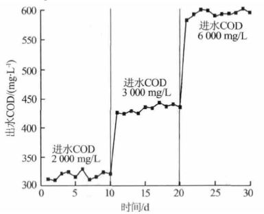 (3)運行效果。高效菌種適應性強,生長繁殖迅速,生存所需條件非常溫和。采用高效菌種結合O/A/O 工藝降解預處理后的蘭炭廢水,其對COD 的最高耐受能力可達6 000 mg/L。試驗過程中控制進水COD 在2 000~3 000 mg/L,COD 去除率高達90%以上,氨氮去除率達80%以上。試驗過程中筆者發現高效菌種在降解污水時的排泥量很少,SV30最高只有11%左右。隨著進水濃度的提高,COD、氨氮的去除率均有所降低。圖 3 為系統中COD 的變化曲線。最終生化出水的COD 為300~400 mg/L,氨氮為10~15 mg/L。
