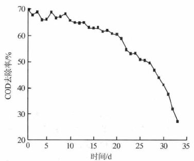 在反應器中均勻投放240~270 g 銅系催化劑,廢水由污水泵從底部打入催化氧化塔,其流量為0.07 L/min,臭氧發生器的出氣管與氧化塔底部的微孔曝氣器相連,臭氧投加量為15~20 g/m3,反應30~45 min 后,COD 去除率為60%以上,最終出水COD可控制在100 mg/L 以下。催化劑連續使用效果如圖 4 所示,在連續反應的前20 d 內催化劑的催化效果較好,COD 去除率均保持在60%以上,繼續延長反應時間催化效果明顯下降,因此當催化劑反應20 d后應該更換及再生。