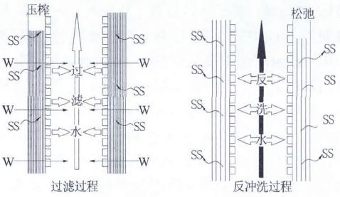 纖維過濾器運行方式為程控自動運行,在過濾過程中對纖維絲施以回轉機具壓榨,使其纖維絲縱向之間孔隙變小,水中的懸浮物均被擋住留在纖維絲外,過濾后得到清潔的處理水。當過濾器內被截留的懸浮污物(雜質)增多,處理水量下降,壓差達到設定值,自動進入反沖洗過程;反洗時讓過濾器的壓榨機具放松,使過濾纖維的孔隙在舒張的狀態下,用羅茨風機來空氣和反洗水合洗,將污物通過排放管排除,然后又自動進入過濾程序。工作原理如圖 1 所示。
