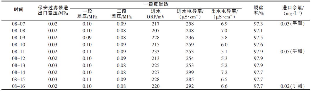 表 2 一級反滲透運行結果 注:以2012-08-07~2012-08-16 十天運行數據為例。