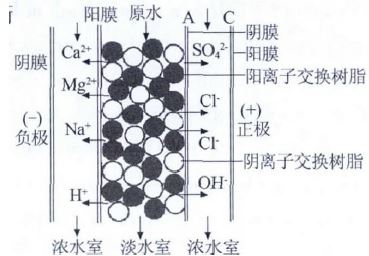由圖 2 可見,工作過程一般分為三個步驟: (1)淡水室中的離子交換樹脂對水中電解質離子的交換作用,去除水中的離子;(2)在外電場作用下,水中電解質沿樹脂顆粒構成的導電傳遞路徑遷移到膜表面并透過離子交換膜進入濃水室;(3)樹脂、膜與水相接觸的擴散層中的極化作用使水解離為H+和OH-,除部分參與負載電流外大多數對樹脂起再生作用。離子交換、離子遷移、電再生相伴發生、相互促進,實現了連續去除離子的過程〔3〕。