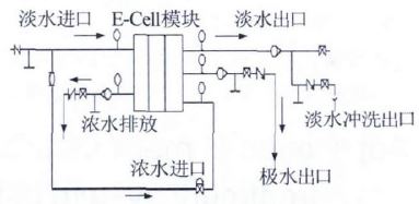(2)因為EDI 模塊系統為直通逆流設計,即淡水及極水進口設置在模塊底部,出口都設置在頂部,極水流由淡水流進口供給,濃水進口設置在模塊頂部,因此運行過程中,為了防止濃水竄入產品水,通過控制濃水進口閥來調節濃水進口與淡水出口之間的壓力差,嚴格控制淡水產水壓力至少比濃水進口壓力大0.035 MPa,EDI 系統示意如圖 3 所示。
