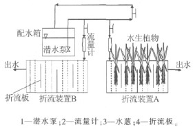 試驗在洱海項目沙坪工作站進行,采用圖1 所示裝置模擬人工濕地進行試驗。圖1 中折流裝置A、B 尺寸均為1.2 m×0.5 m×0.8 m,每個裝置設3 個上下折流板,均分成4 個槽,以生物填料為基質,每個槽中均勻垂直懸掛彈性填料20 根,其中裝置A 中每根填料周圍種有3 株水蔥,與裝置B 進行對照試驗。裝置供水是通過1 個2 m3的配水箱經過水泵輸送到裝置A 和裝置B 中,其中水力負荷通過玻璃轉子流量計進行控制。