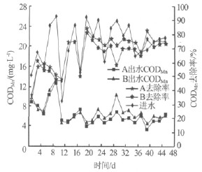 裝置A、B 中進出水CODMn變化趨勢以及去除率的比較見圖2。