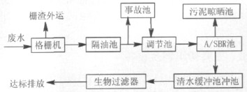 廢水經隔油池去飄浮油,自流入調節池。調節池設一級潛污提升泵兩臺,將廢水提升入A/SBR 池,通過好氧和兼氧微生物的作用:在好氧階段將廢水中的COD、NH3-N 等污染物分解、轉化為H2O、CO2、NO2-、NO3- 等物質,此時應根據實際情況補加碳酸鈉;在兼氧階段將NO2-、NO3-轉化為N2,大幅度去除廢水中COD 和NH3-N,此時根據實際情況補加甲醇。處理后SBR 出水靜壓流入緩沖池,經過生物過濾器,生物菌被生物濾料截留,反洗時再送回A 池,過濾器出水送入外排地溝。