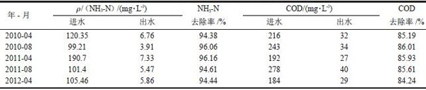 從表2 數據來看,各項污染物處理后均可達到排放水標準要求,平均出水氨氮質量濃度、COD 分別為5.87 mg/L,32.4 mg/L,去除率分別為95.13% ,85.40 %,處理效果均優于設計指標。