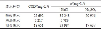 取吸收廢水300 mL,用質(zhì)量分?jǐn)?shù)10%硫酸調(diào)節(jié)pH 至2.65,依次加入H2O2(質(zhì)量分?jǐn)?shù)30%)3 mL,硫酸亞鐵(質(zhì)量分?jǐn)?shù)10%)0.3 mL,粉末活性炭5mg,攪拌反應(yīng)8 h 后,先用石灰乳調(diào)節(jié)廢水的pH 到10.5,然后分別依次加入FeCl3(質(zhì)量分?jǐn)?shù)37%)3滴,PAM(質(zhì)量分?jǐn)?shù)0.05%)1.5 mL,攪拌反應(yīng)后靜置2 h,取濾液測定各廢水COD。