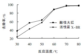 試驗溫度分別為30、40、50、60、70、80 ℃,pH 值為6,催化劑投加量為40 g/L,過氧化氫投加量為80 mL/L,反應時間為1 h,考察溫度對染料廢水處理效果的影響,結果見圖3。