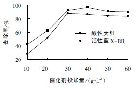 試驗中,催化劑投加量分別為10、20、30、40、50、60 g/L,pH 值為6,過氧化氫投加量為80mL/L,反應時間為1 h,溫度為60 ℃,考察催化劑對染料廢水處理效果的影響,結果見圖5。