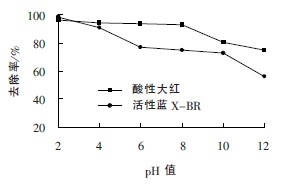 通過對比試驗可知,采用非均相催化氧化法處理模擬廢水,酸性大紅和活性藍X-BR 的去除率均達到90%以上。而采用單獨催化和單獨氧化法,去除率則較低。