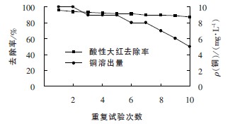 由圖9 可知,進行了10 次催化劑的重復利用試驗,酸性大紅的去除率始終高達85%以上,去除效果良好。銅溶出量是衡量催化劑穩(wěn)定性的另一個方面,通過圖9 可以發(fā)現(xiàn),銅溶出量逐漸降低,這可能是因為粉末活性炭和活性氧化鋁都是非常好的吸附劑,吸附性能好。凹凸棒粘性強,同時也具有一定的吸附能力。粉末活性炭、活性氧化鋁和凹凸棒復合,使得催化劑的強度增加,方便回收利用,氧化銅被固定在內部,形成了高效的催化劑。