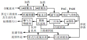 含氰廢水直接排入破氰池中,通過物化反應將CN- 去除后,出水自流進入調節池,與變換、精餾、硫回收、脫碳脫硫等工段產生的廢水、生活污水及BAF 反沖洗廢水、污泥濃縮池上清液和污泥脫水機壓濾出水進行水質、水量調節后,經泵提升至淺層氣浮機,通過投加PAC、PAM 去除廢水中的懸浮物;氣浮系統出水自流進入A/O 池,大部分有機污染物在此被去除;生化處理系統出水在二沉池泥水分離后進入絮凝沉淀池,污水與藥劑在絮凝池混勻后進入沉淀池,懸浮物得到進一步去除;沉淀池出水經泵送至BAF,出水可達標排放。