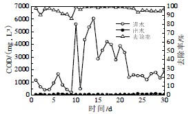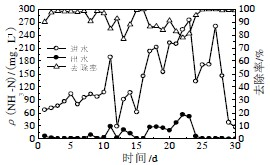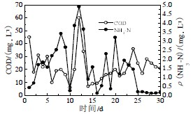 系統運行時,A/O 系統處理效果穩定,對COD、氨氮處理效果良好,圖3 和圖4 示出A/O 系統穩定運行時監測數據。