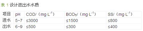 二廠區(qū)滿負荷生產(chǎn)情況下日均污水量約1 100 m3,考慮20%不可預(yù)見水量,設(shè)計處理水量按1 320 m3/d算。廢水經(jīng)處理后納入市政污水管網(wǎng),出水水質(zhì)執(zhí)行《污水綜合排放標準》(GB 8978—1996)三級標準,設(shè)計進出水水質(zhì)見表 1。