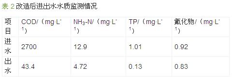 由表 2 可以看出,改造后不僅有機物處理效果好,對氨氮、總磷也起到了協(xié)同處理作用。此外,還在2011 年12 月—2012 年2 月對該工程在冬季低溫條件下對有機物的處理效果進行了監(jiān)測,結(jié)果顯示:期間進水COD 在2 000~4 000 mg/L,平均2 882 mg/L,出水COD 平均58 mg/L,基本能保持在100 mg/L 以下,COD 總體去除率達到95%以上,其中物化沉淀去除率12%~14%,水解酸化去除率10%~30%,MBR去除率50%~75%,處理效果穩(wěn)定,出水水質(zhì)優(yōu)良。