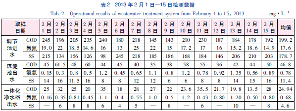 表2為2013 年2 月1 日—15 日廢水處理系統的COD、氨氮和SS 的檢測數據(水溫平均為12 ~15℃) 。