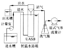 UASB 厭氧反應器內徑9 cm、高70 cm,其中三相分離器高度為8 cm,總有效容積為3 L,反應器放置在恒溫水浴箱中,溫度控制在(37±2)℃。反應器接種污泥取自昆山市某果汁廢水處理站內循環厭氧反應器(IC)塔中的顆粒污泥(水的質量分數90%,密度約為1.2 g/L),大部分呈黑色,粒徑均勻,接種顆粒污泥的體積約占UASB 反應器容積的1/3。其流程圖如圖1 所示。