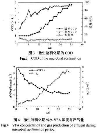 由圖3 和圖4 可知,進水COD 從1.0 g/L 穩步提高至5.628 g/L,容積負荷由1.0 kg/(m3·d)增加至5.7kg/(m3·d),反應器啟動初期厭氧微生物活性還沒有恢復,故前4 d 的COD 去除率不高,僅為40%~60%;隨著厭氧微生物活性的逐步恢復,第5 天COD 的去除率上升到80%左右;啟動第6~25 天內,反應器去除率已經能穩定在90%,出水COD 保持在500 mg/L以下,出水pH 在7.1~7.4,出水中VFA 的濃度穩定在2~3 mmol/L,產氣量穩步提升。可認為經過25 d的馴化,厭氧微生物已很好的適應了該廢水,污泥馴化成功。