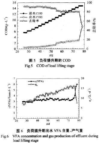 由圖5 和圖6 可以看出,在負荷提升的初期,過程中污泥對該種廢水的適應性良好,COD 去除率在第26~45 天一直保持在90%以上;隨著負荷的逐步提升,從初期的5.7 kg/(m3·d)上升到14.3 kg/(m3·d)時,COD 去除率穩定在80%以上。出水COD 保持在3.0 g/L 以下、pH 也始終保持在7.4~7.7、VFA 濃度維持在3 mmol/L 左右,反應器產氣量逐步上升。