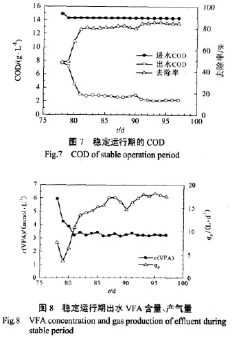 由圖7 和圖8 可以看出,穩定運行期內,容積負荷維持在14.3 kg/(m3·d),反應器的COD 去除率恢復到80%以上,后期穩定在85%。出水VFA 的濃度逐步回至3 mmol/L 左右,出水pH 穩定在7.5 左右,產氣體積流量穩定在17 L/d 左右。說明UASB 反應器處于運行良好狀態,系統具有較好的緩沖能力,運行穩定。